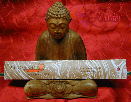 Auroshikha Räucherstäbchen mit dem samtig holz-balsamischen Duft von Sandelholz. Sandalwood Agarbathies Packungsinhalt hat ca. 10 bis 12 Stäbchen